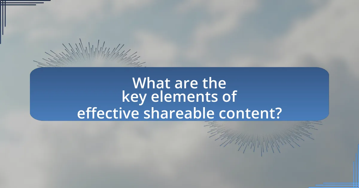 The key elements of effective shareable content include relevance, emotional appeal, and clear calls to action. Relevance ensures that the content resonates with the target audience, increasing the likelihood of sharing. Emotional appeal engages users on a personal level, as studies show that content evoking strong emotions is more likely to be shared; for instance, a 2016 study by the New York Times found that emotionally charged articles received 30% more shares than neutral ones. Clear calls to action guide users on what to do next, enhancing engagement and driving donations.